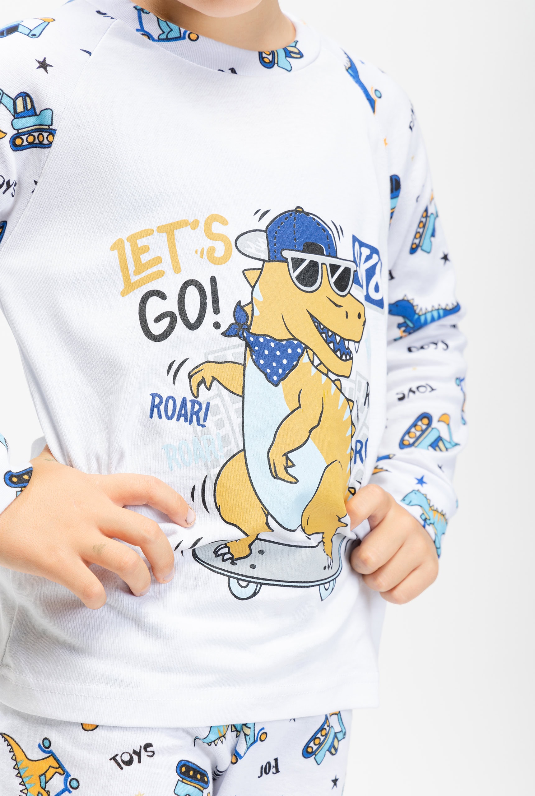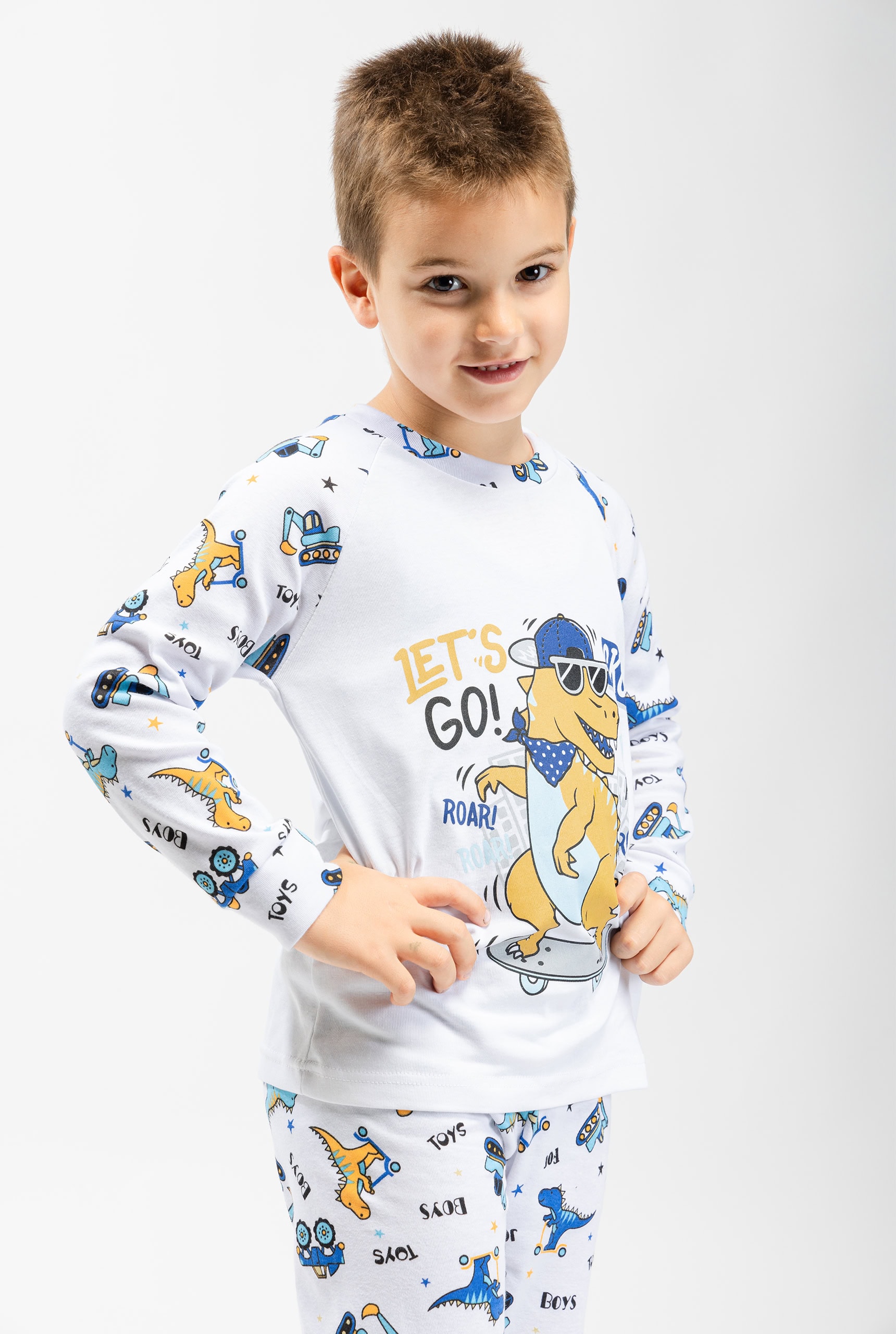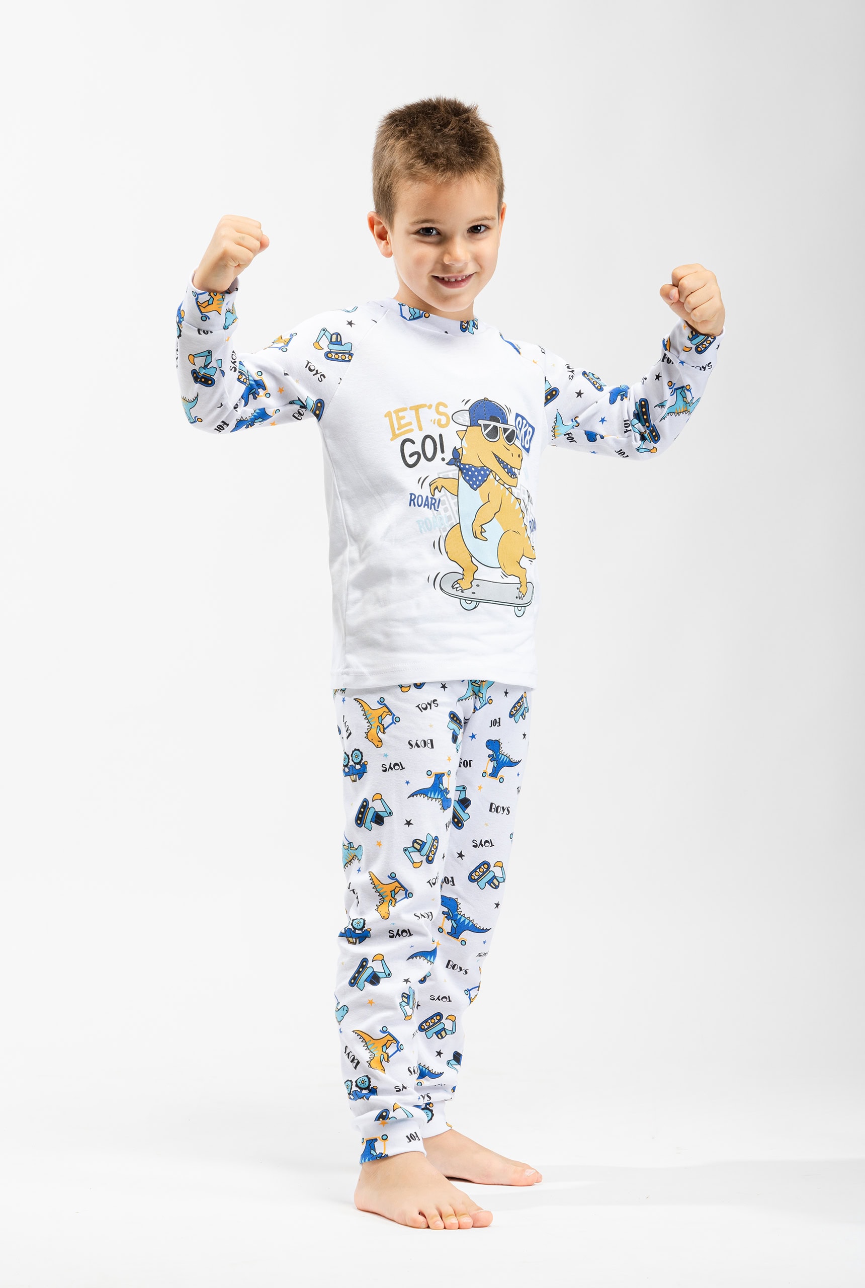 Dečija pidžama za dečake sa motivom medveda, dugi rukavi, bež gornji deo i tamne pantalone sa printom, pamuk, udobna pidžama za spavanje